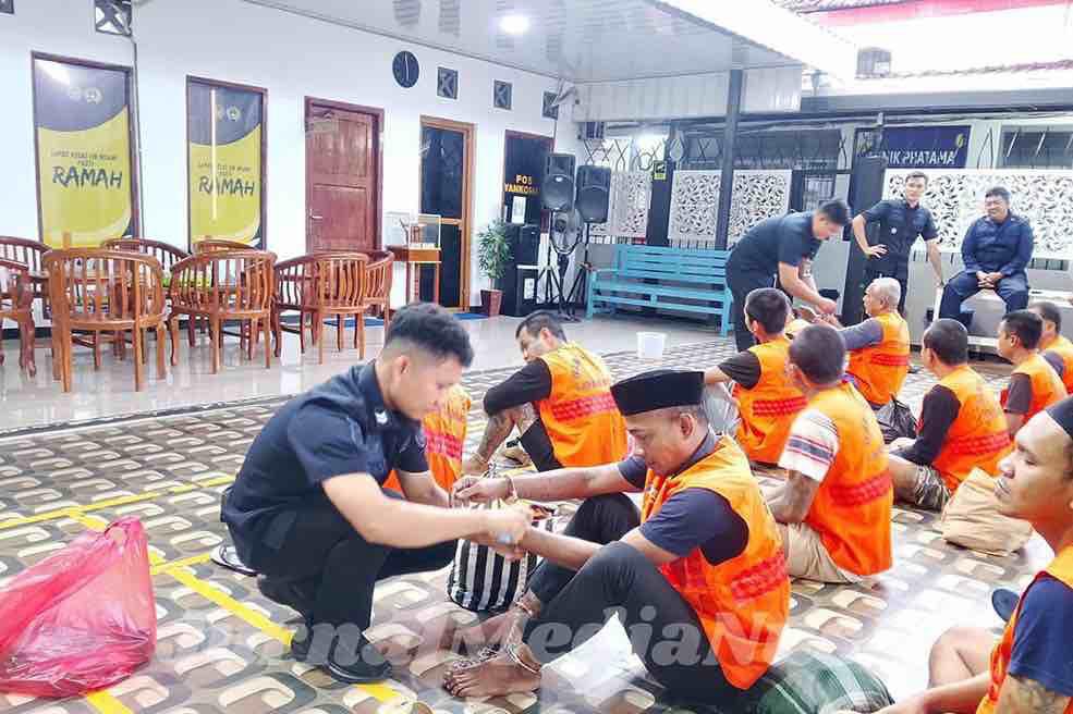 Petugas Lapas Ngawi melakukan pemeriksaan dan pengawalan terhadap warga binaan sebelum proses pemindahan ke Lapas Lamongan, Sabtu (28/2/2026). (Dok.JurnalMediaNusa)