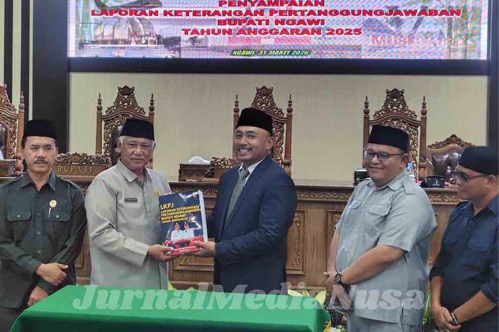 Penyerahan dokumen LKPJ Bupati Ngawi Tahun Anggaran 2025 kepada DPRD Ngawi dalam rapat paripurna di Pendopo Wedya Graha. (Dok.JurnalMediaNusa)
