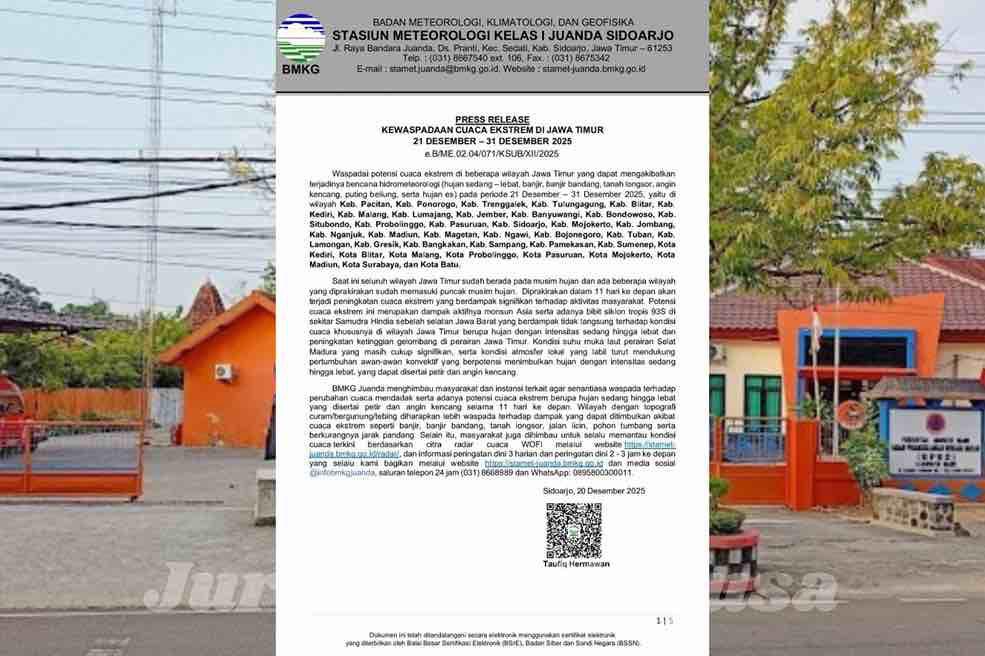 Press release resmi dari BMKG Stasiun Meteorologi Kelas I Juanda Sidoarjo mengenai peringatan dini kewaspadaan cuaca ekstrem di wilayah Jawa Timur untuk periode 21–31 Desember 2025. (Dok.JurnalMediaNusa)