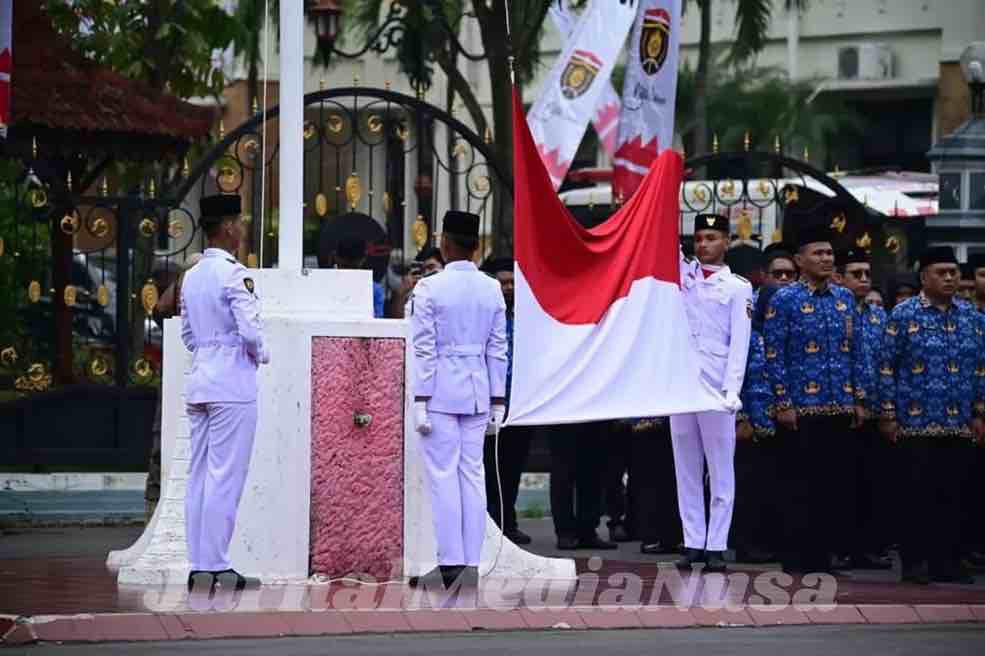 Pengibaran bendera Merah Putih pada upavara peringatan Hari Pahlawan ke-80 di Pendopo Wedya Graha, Senin (10/11/2025). (Dok.JurnalMediaNusa)