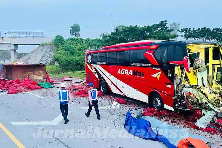 Ngawi (JurnalMediaNusa) – Kecelakaan lalu lintas terjadi di ruas Tol Solo–Ngawi KM 566, Desa Bangunrejo Kidul, Kecamatan Kedunggalar, Kabupaten Ngawi, Jawa Timur, Sabtu pagi (21/3/2026). Bus Agra Mas yang mengangkut pemudik dari Tangerang menuju Lamongan menabrak truk bermuatan bawang merah yang berhenti di pinggir jalan.