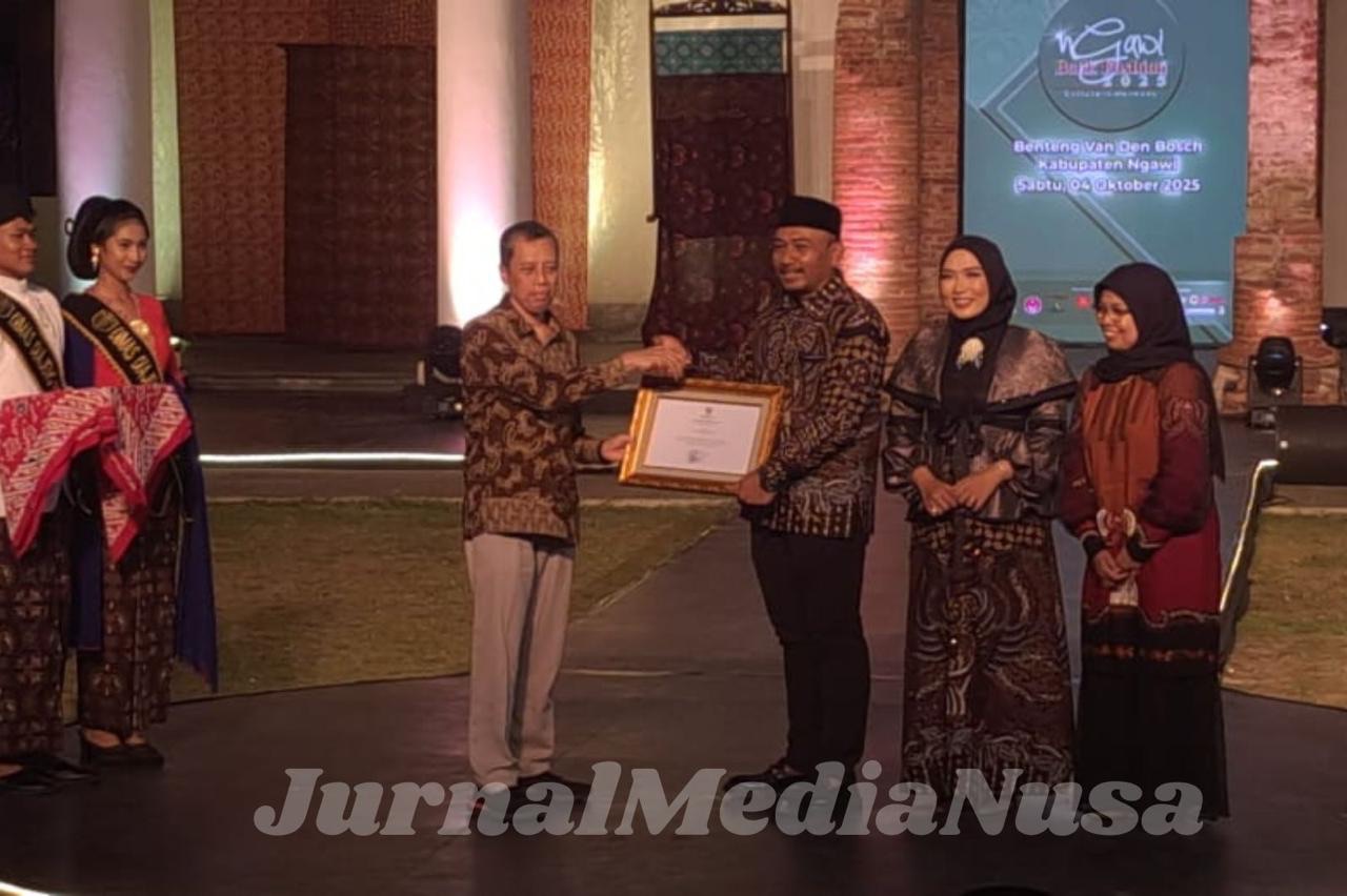 Bupati Ngawi Ony Anwar Harsono menerima piagam penghargaan dalam ajang Ngawi Batik Fashion (NBF) 2025 di Benteng Van Den Bosch, Sabtu (4/10/2025). (Dok.JurnalMediaNusa)