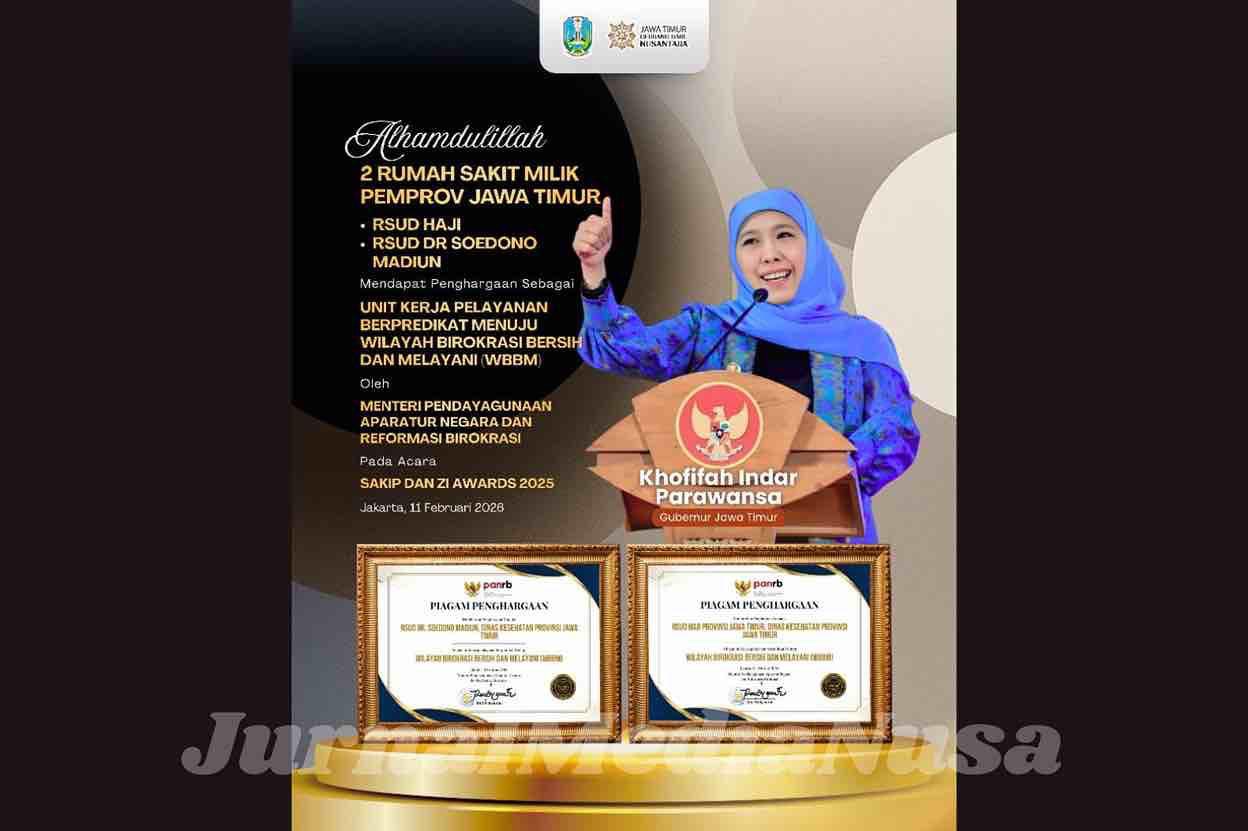 Jakarta (JurnalMediaNusa) – Dua Rumah Sakit Umum Daerah (RSUD) milik Pemerintah Provinsi Jawa Timur meraih predikat Zona Integritas Menuju Wilayah Birokrasi Bersih dan Melayani (WBBM) 2025 dari Kementerian Pendayagunaan Aparatur Negara dan Reformasi Birokrasi (PANRB), Rabu (11/2).