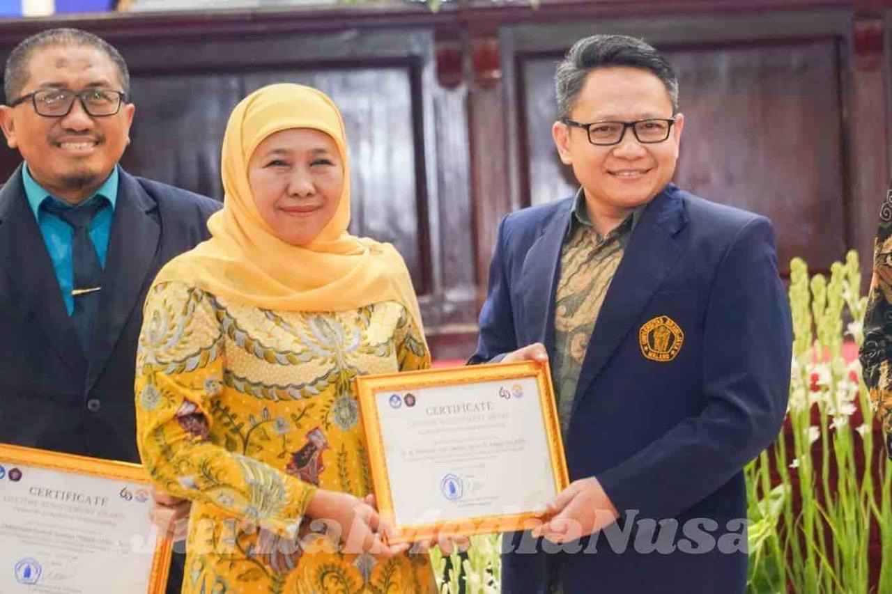 Gubernur Jawa Timur Khofifah Indar Parawansa menerima sertifikat penghargaan dari Universitas Brawijaya pada Sidang Pleno Terbuka Dies Natalis ke-63 UB di Gedung Samantha Krida, Kota Malang, Senin (5/1/2026). (Dok.JurnalMediaNusa)