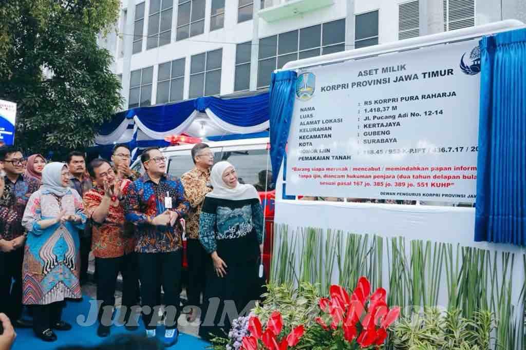 Gubernur Jawa Timur Khofifah Indar Parawansa meresmikan RS KORPRI Pura Raharja sebagai aset KORPRI Pemprov Jatim di Surabaya, ditandai pembukaan papan aset rumah sakit. (Dok.JurnalMediaNusa)