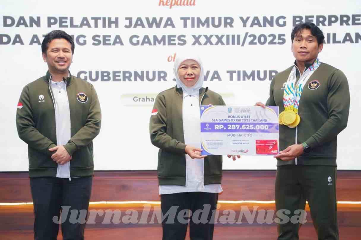 Surabaya (JurnalMediaNusa) – Gubernur Jawa Timur Khofifah Indar Parawansa menyerahkan bonus total Rp8 miliar kepada 161 atlet dan pelatih asal Jawa Timur yang berprestasi pada ajang SEA Games XXXIII 2025 di Thailand. Penyerahan bonus berlangsung di Gedung Negara Grahadi, Surabaya, Jumat (30/1).