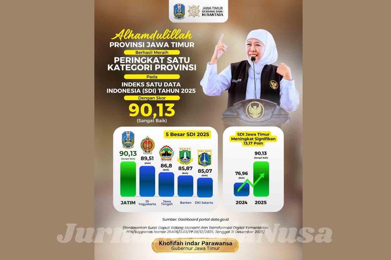 Surabaya (JurnalMediaNusa) – Pemerintah Provinsi Jawa Timur kembali mencetak prestasi nasional. Berdasarkan Evaluasi Penyelenggaraan Satu Data Indonesia (SDI) Tahun 2024 yang ditetapkan sebagai Indeks SDI 2025, Jawa Timur berhasil meraih peringkat satu nasional dengan skor 90,13.