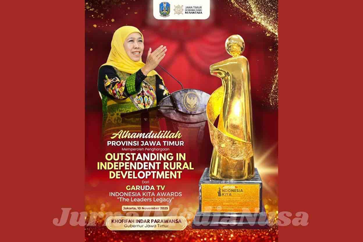 Surabaya (JurnalMediaNusa) – Pemerintah Provinsi Jawa Timur kembali menorehkan prestasi nasional. Kali ini, Jatim meraih penghargaan bergengsi Indonesia Kita Awards “The Leaders Legacy” untuk kategori Outstanding In Independent Rural Development dari Garuda TV. Ajang penghargaan tersebut digelar di Yudhistira Grand Ballroom, Patra Jasa Office Tower, Jakarta, pada Senin (10/11) malam.