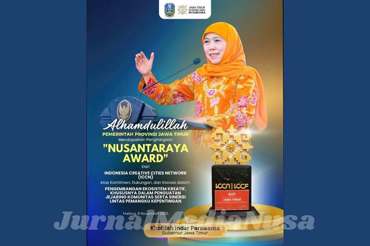 “Alhamdulillah, Jawa Timur berhasil meraih Nusantaraya Award dari ICCN. Ini berkat komitmen dan inovasi yang terus kami dorong dalam membangun ekosistem kreatif, memperkuat jejaring, serta kolaborasi lintas sektor,” ujar Gubernur Khofifah di Gedung Negara Grahadi, Surabaya, Sabtu (8/11).