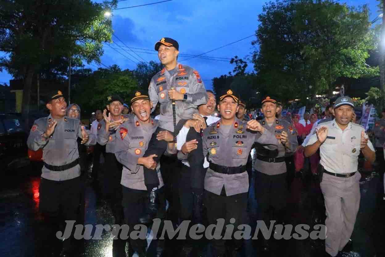 Menariknya, di tengah rintik hujan, para Pejabat Utama (PJU) Polres Ngawi secara spontan mengangkat AKBP Prayoga. Aksi tersebut menjadi simbol kepercayaan, kebanggaan, serta harapan besar personel terhadap kepemimpinan baru.