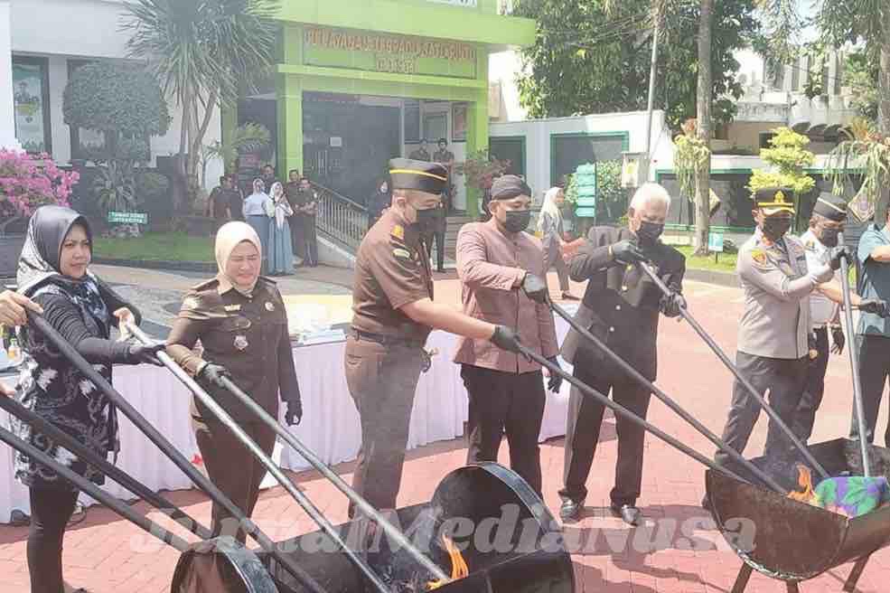 Kepala Kejari Ngawi bersama Forkompimda memusnahkan barang bukti dengan cara dibakar di halaman kantor Kejari Ngawi. (Dok.JurnalMediaNusa)