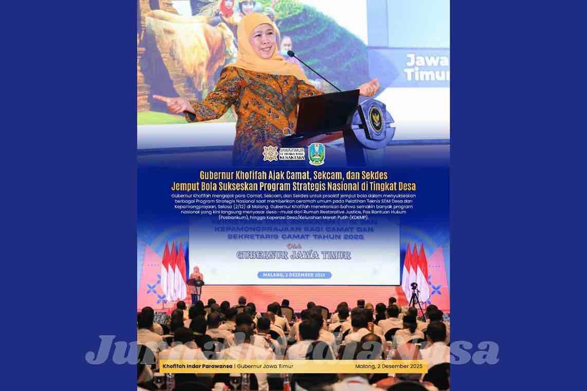 Malang (JurnalMediaNusa) – Gubernur Jawa Timur Khofifah Indar Parawansa mengajak para camat, sekretaris camat (sekcam), dan sekretaris desa (sekdes) bergerak proaktif melakukan jemput bola untuk menyukseskan berbagai program strategis nasional. Ajakan ini ia sampaikan saat memberi ceramah umum pada Pelatihan Teknis Peningkatan Kapasitas SDM Sekretaris Desa Angkatan I–IV dan Kepamongprajaan bagi Camat serta Sekcam Tahun 2025 di Savana Hotel & Convention, Malang, Selasa (2/12).