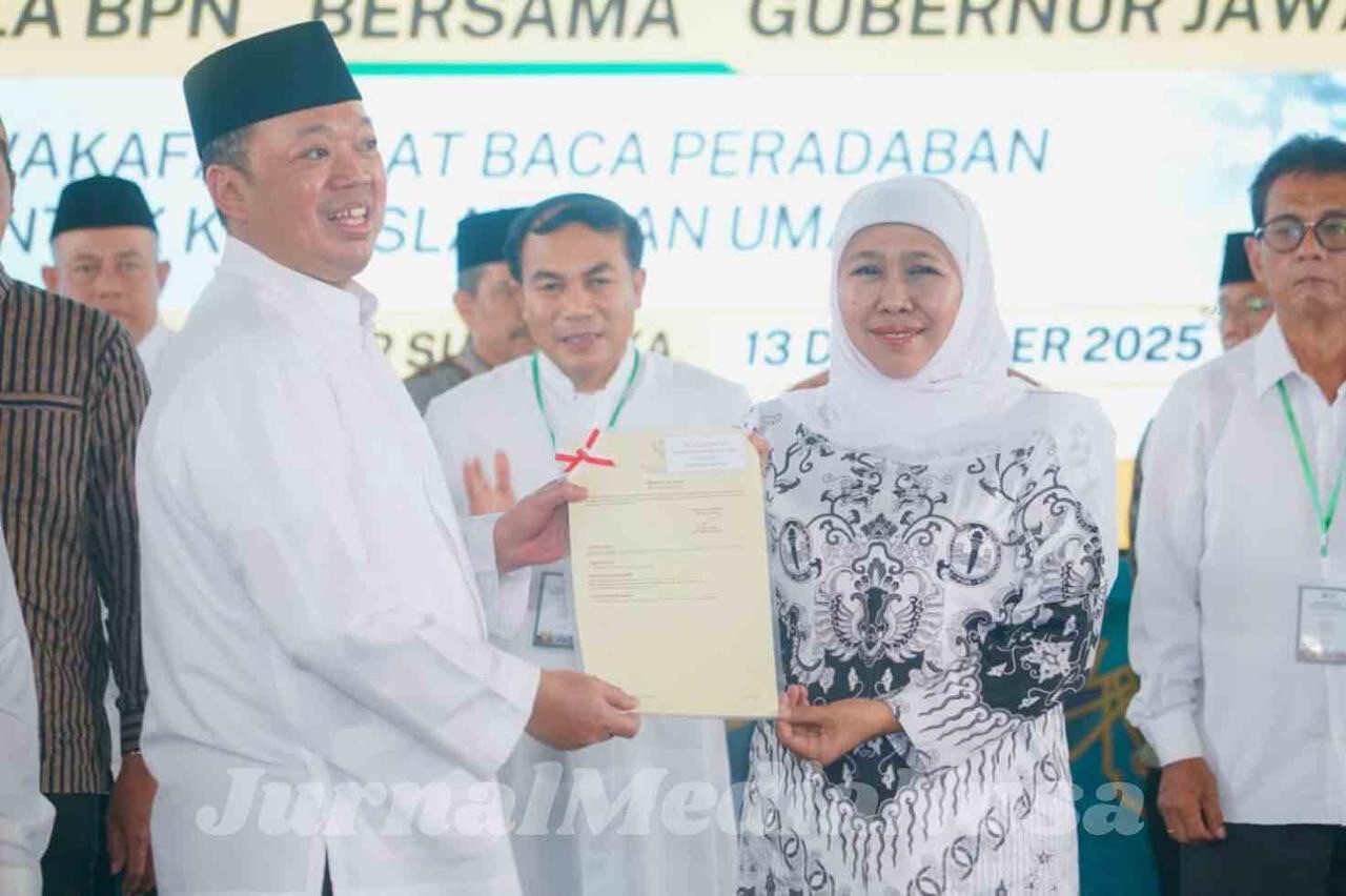 Surabaya (JurnalMediaNusa) – Gubernur Jawa Timur Khofifah Indar Parawansa bersama Menteri Agraria dan Tata Ruang/Kepala BPN Nusron Wahid menyerahkan 2.532 sertipikat tanah wakaf dan tempat ibadah di Masjid Nasional Al Akbar Surabaya, Sabtu (13/12). Penyerahan ini menjadi langkah strategis untuk memperkuat kepastian hukum aset keagamaan dan sosial di Jawa Timur.