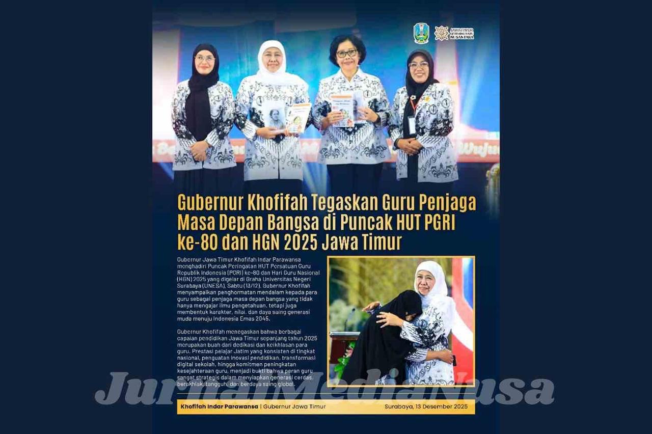 Surabaya (JurnalMediaNusa) – Gubernur Jawa Timur Khofifah Indar Parawansa menegaskan peran strategis guru sebagai pembentuk karakter dan penentu kualitas generasi masa depan. Hal itu ia sampaikan pada Puncak Peringatan HUT PGRI ke-80 dan Hari Guru Nasional 2025 Tingkat Provinsi Jawa Timur di Graha Universitas Negeri Surabaya (UNESA), Sabtu (13/12/2025).