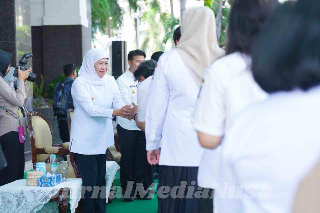 Surabaya (JurnalMediaNusa) – Gubernur Jawa Timur, Khofifah Indar Parawansa, memimpin apel pagi Aparatur Sipil Negara (ASN) Pemerintah Provinsi Jawa Timur usai libur Idul Fitri 1447 H, Rabu (25/3). Dalam kesempatan tersebut, ia menegaskan penerapan kebijakan Work From Home (WFH) sebagai langkah efisiensi energi tanpa mengurangi kualitas layanan publik.