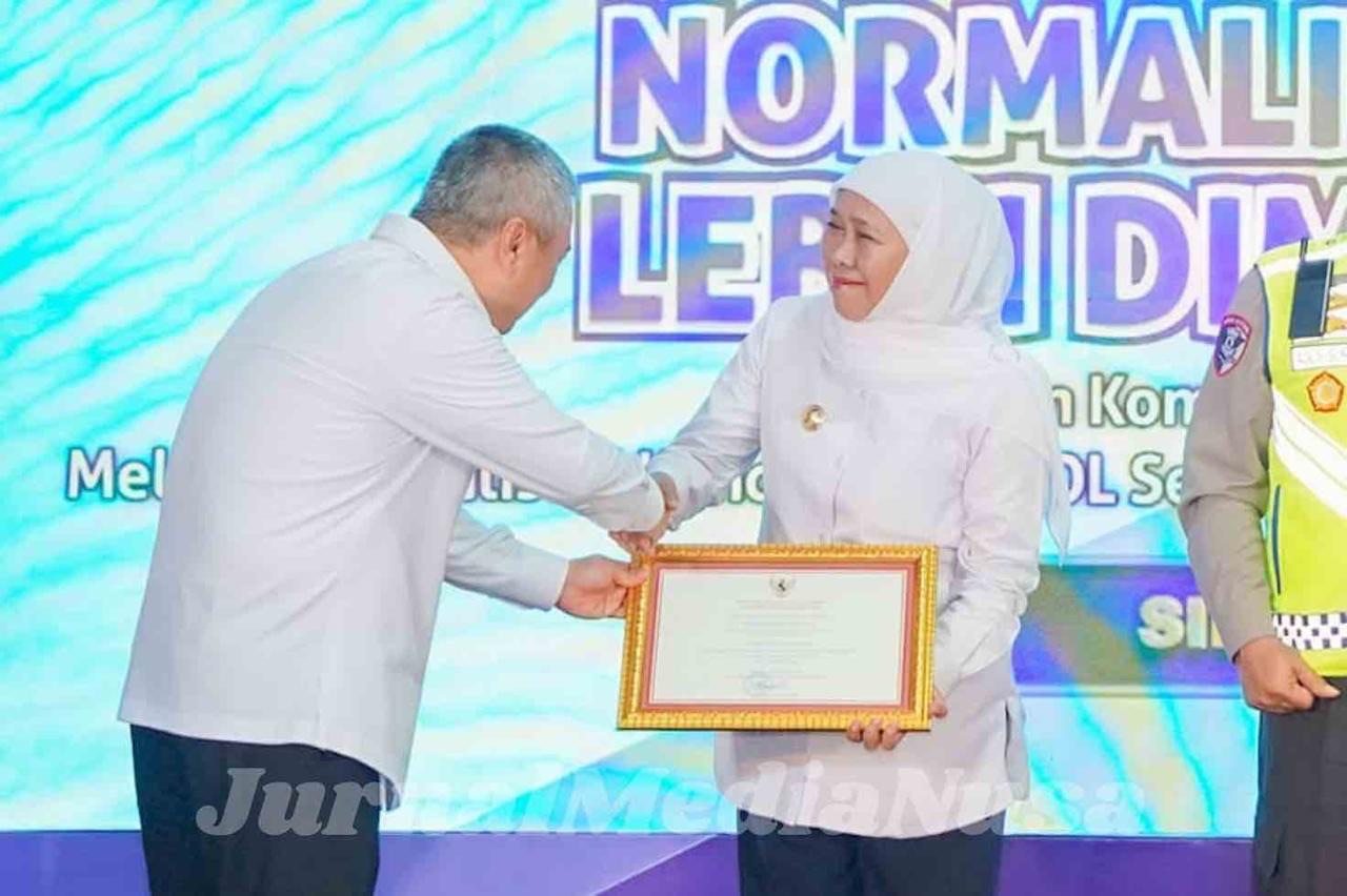 Sidoarjo (JurnalMediaNusa) – Gubernur Jawa Timur Khofifah Indar Parawansa menerima penghargaan dari Menteri Perhubungan RI Dudy Purwagandhi. Penghargaan ini merupakan wujud dukungannya dalam percepatan implementasi program penanganan kendaraan Over Dimension Over Load (ODOL) sepanjang 2025.