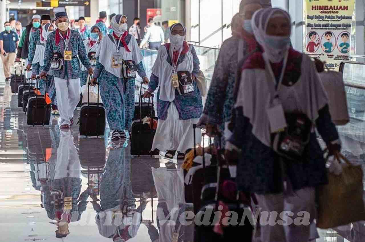 Suasana rombongan jemaah haji saat berada di bandara membawa perlengkapan keberangkatan. Berdasarkan data Kemenhaj Ngawi per November 2025, sebanyak 375 jemaah asal Ngawi dijadwalkan akan mengisi kuota keberangkatan untuk musim haji tahun 2026 mendatang. (Dok.JurnalMediaNusa)