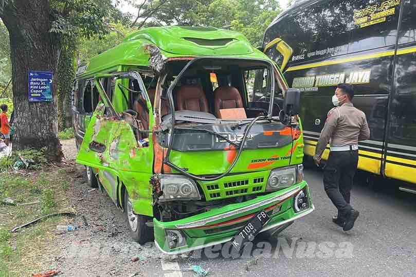 Kondisi minibus ringsek usai menabrak pemotor dan menghantam pohon di Jalan Raya Ngawi–Maospati, Kecamatan Geneng, Kabupaten Ngawi, Selasa (27/1/2026). (Dok.JurnalMediaNusa)