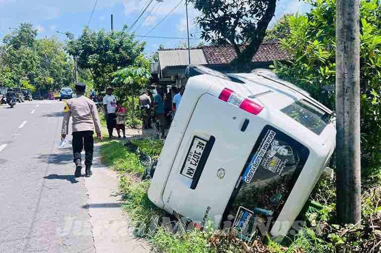 Minibus terguling di tepi jalan Desa Pelang Kidul usai menabrak pemotor yang menyeberang. (Dok.JurnalMediaNusa)