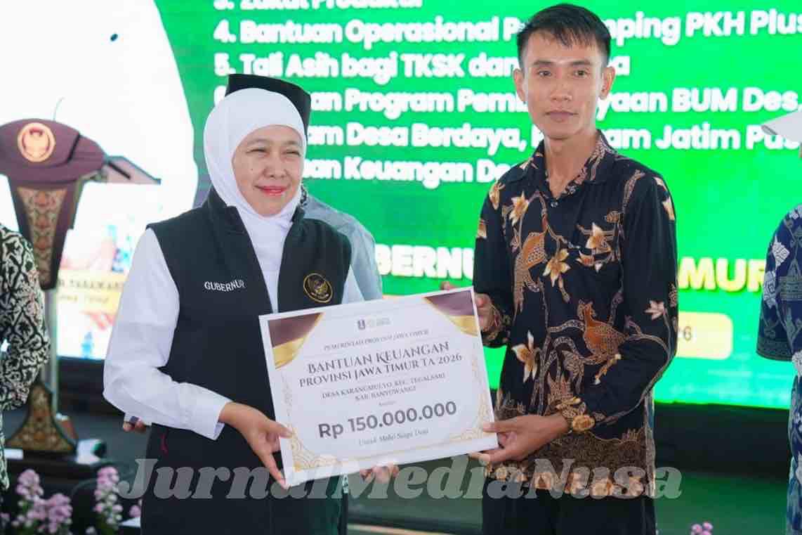 Gubernur Jawa Timur Khofifah Indar Parawansa menyerahkan bantuan keuangan Provinsi Jatim Tahun Anggaran 2026 kepada perwakilan desa di Banyuwangi, Sabtu (28/2/2026). (Dok.JurnalMediaNusa)