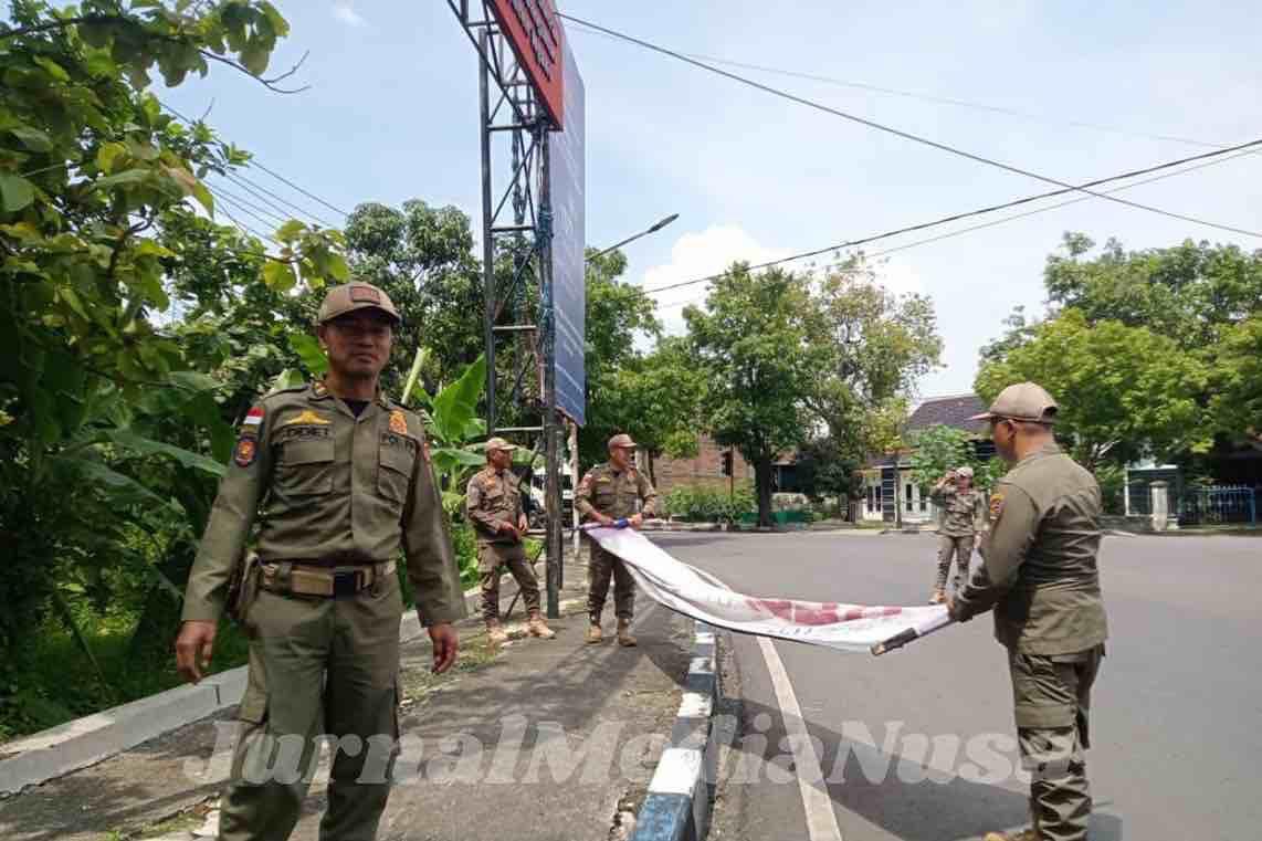 Petugas Satpol PP Kabupaten Ngawi menertibkan atribut dan aktivitas pengamen di kawasan perempatan jalan dalam upaya menjaga ketertiban dan keselamatan lalu lintas. (Dok.JurnalMediaNusa)