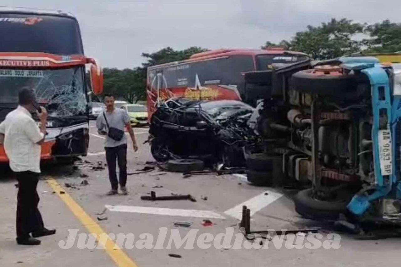 Ngawi (JurnalMediaNusa) – Kecelakaan lalu lintas beruntun melibatkan dua bus, satu truk, dan satu mobil terjadi di ruas Tol Solo–Ngawi, Jawa Timur, Sabtu (7/2/2026) siang. Insiden tersebut mengakibatkan dua orang mengalami luka dan harus menjalani perawatan medis.