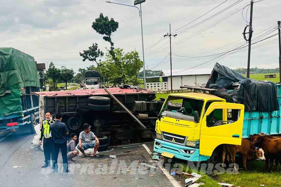 Ngawi (JurnalMediaNusa) – Kecelakaan lalu lintas terjadi di Jalan Raya Ngawi–Madiun, tepatnya di wilayah Kecamatan Padas, Kabupaten Ngawi, Jumat pagi (13/2/2026). Dua truk terlibat tabrakan frontal yang mengakibatkan tujuh orang luka-luka serta dua ekor sapi mati di lokasi kejadian.