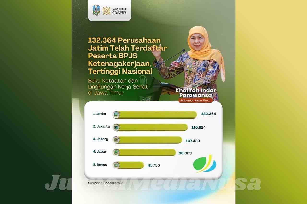 Data Kementerian Ketenagakerjaan RI menunjukkan, jumlah tersebut menempatkan Jawa Timur di peringkat pertama secara nasional. Jawa Timur melampaui DKI Jakarta dengan 116.824 perusahaan, Jawa Tengah 107.420 perusahaan, serta Jawa Barat 98.029 perusahaan. Secara nasional, total perusahaan peserta BPJS Ketenagakerjaan mencapai 875.641 perusahaan.