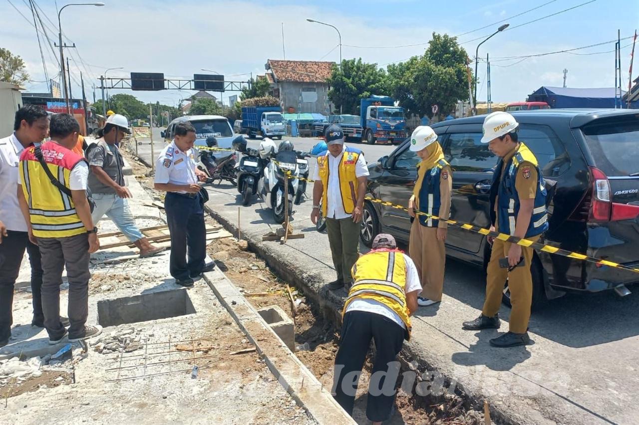 Petugas DPUPR Ngawi bersama jajaran terkait meninjau progres pembangunan trotoar di kawasan sekitar GOR Bung Hatta. (Dok.JurnalMediaNusa)